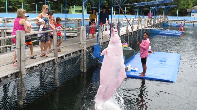 Vaaleanpunainen delfiini esittelee kalannappaustaitojaan