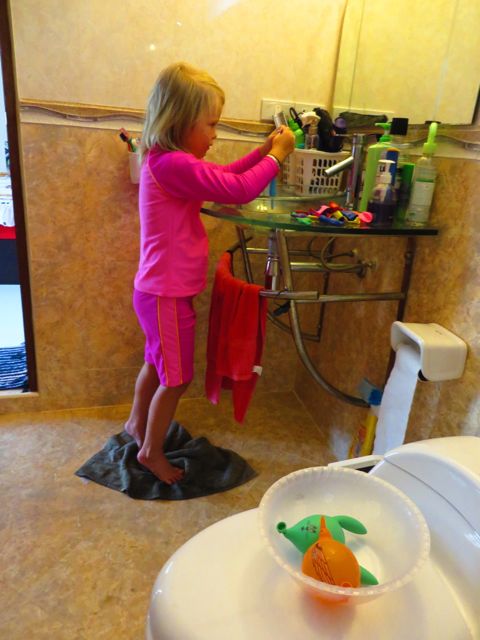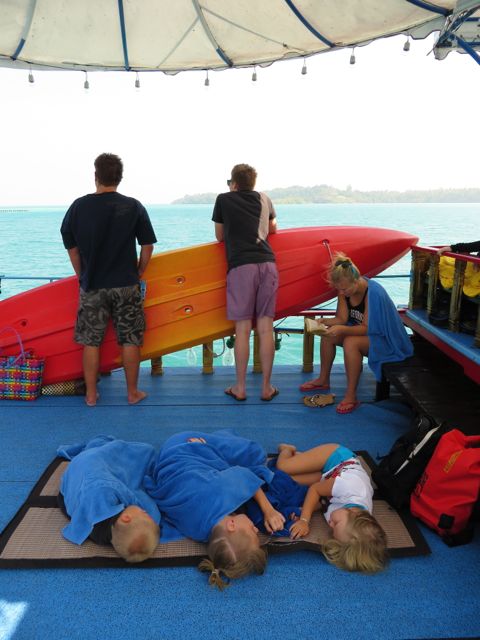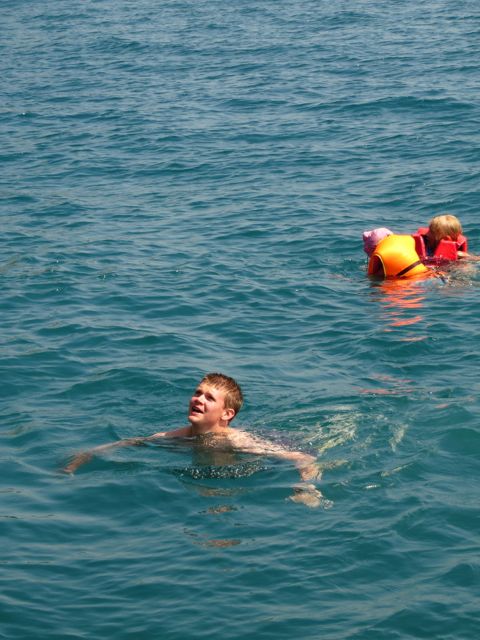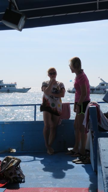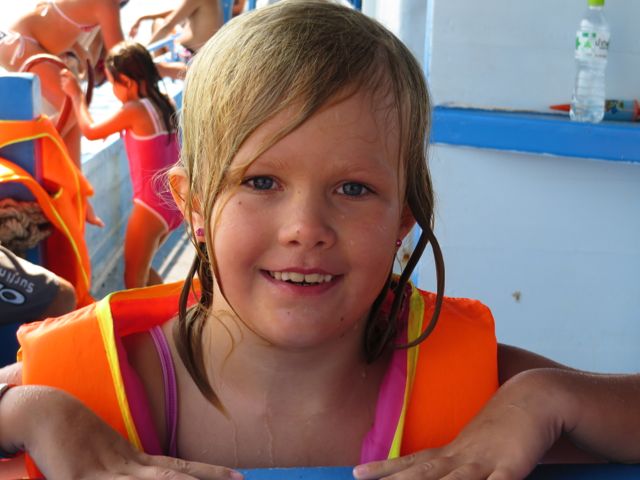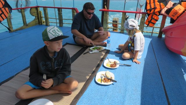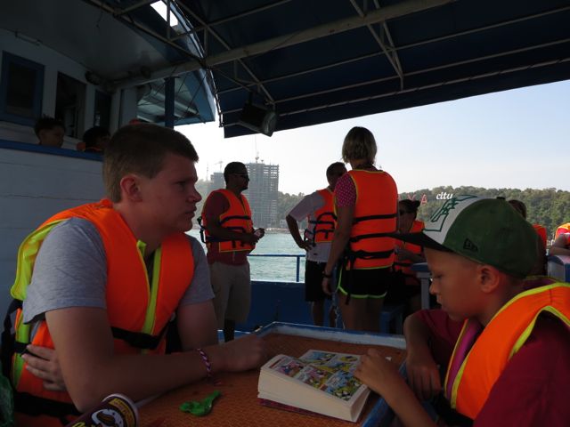 Opettajat ja harjoittelijat suunnittelivat uusia lukujärjestyksiä, muutoin ei kouluhommia sinä päivänä tehty! Uitiin ja hypeltiin laivan yläkannelta ja reunoilta, ja syötiin maittava lounas, paistettua riisiä ja kanaa ja supisuomalaista jauheliha-perunasoselaatikkoa, sekä vihanneksia ja hedelmiä. Toki kaikilla oli omia herkkuja mukana myös. Lukuvuoden ensimmäinen laivaretki oli hyvin onnistunut, eikä varmastikaan viimeinen tälle vuodelle!