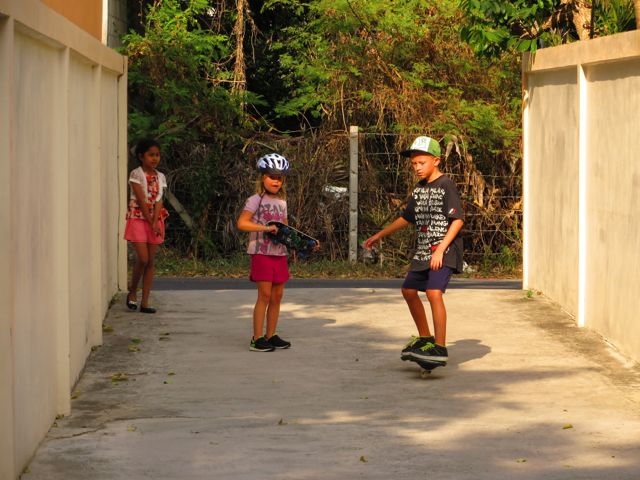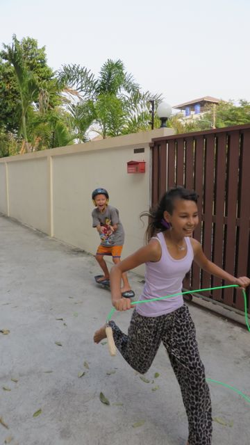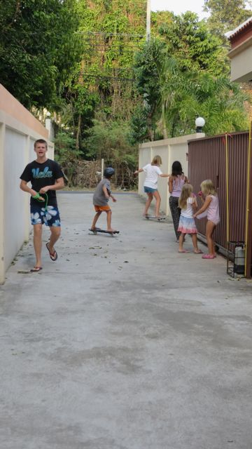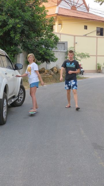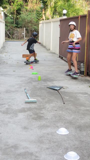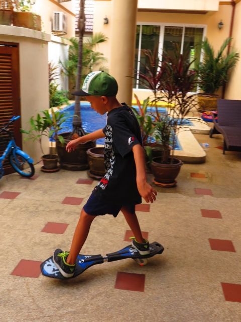 Lapsista ei siis tullut ainakaan vielä jalkapallon harrastajia, mutta paluumatkalla tapahtui onnekas käänne. Ajelimme kotia kohti, kun Sukhumvitin ja Thepprasit Roadin kulmassa olevan Outlet Mallin suuri urheilivälinekauppa sattui silmiin. Päätimme mennä kysymään täältä sählymailoja, joita tarvittaisiin koululle, mutta joita ei näköjään ainakaan Pattayalta mistään löydy! Sählymailoja ei ollut, eivätkä täälläkään myyjät meinanneet aluksi edes ymmärtää mistä on kyse. Tarvittiin aika paljon body languagea ja vertailua mm. jääkiekkoon ennenkuin hoksasivat ”ooo, floorball…!”. Mutta löysimme lapsille lenkkarit ja mikä parasta, alennushyllystä -70% hintaan katuskeittilaudat! Hintaa jäi lopulta vain reilu 20€/lauta.