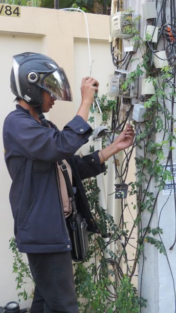 Keskiviikkona meiltä katkesi yhtäkkiä sähköt. Mennessämme tarkistamaan sähkömittaria huomasimme sen kokonaan kadonneen. Asialla oli ilmeisimminkin sähkölaitos. Täällähän on tapana, että jos jätät sähkölaskun maksamatta, niin rahoja ei vaivauduta karhuamaan, vaan sähkön toimitus keskeytetään saman tien, sen enempää kyselemättä! Ongelma oli vaan se, ettei meillä ollut tietääksemme maksamattomia laskuja, vaan juuri edellisenä päivänä tullut lasku, jolla oli maksuaikaa vielä viikon päivät.