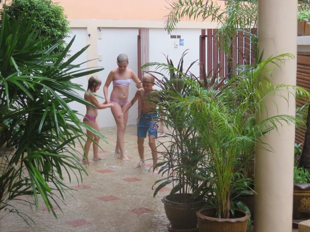 Tämä on orpokodin pitäjien oma koti. Oikealla suuri savesta tehty sadevesitynnyri, johon kerätään katolta juomavettä. Näitä oli joka rakennuksen kulmalla